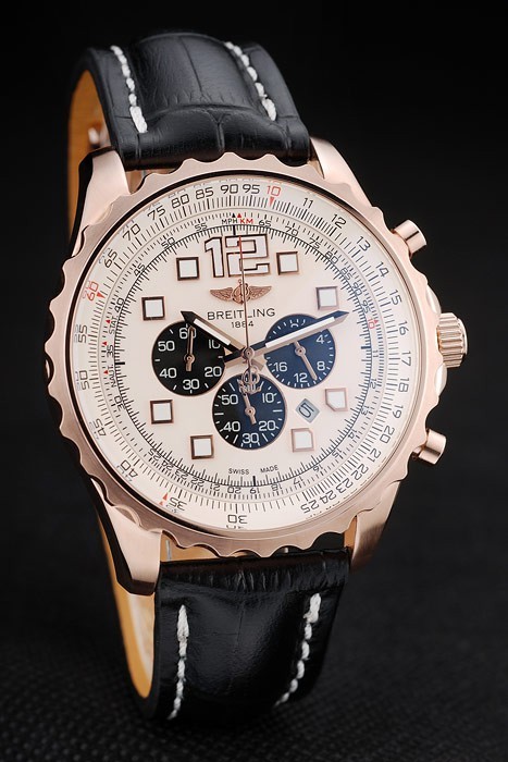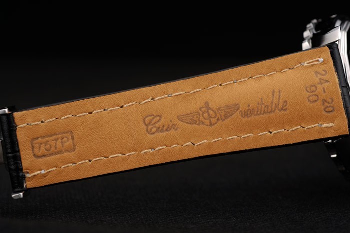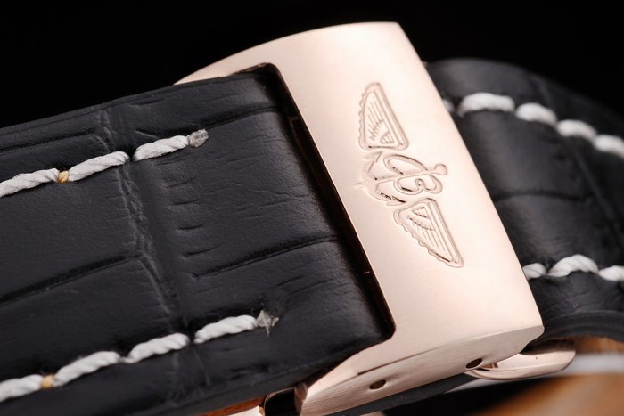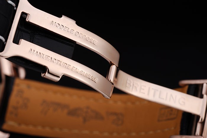 Bracelet: Calor en relieve nombre de Breitling y el logotipo de cocodrilo negro correa de cuero con pespuntes de hilo blanco y el logo grabado oro rosa plateado plegable en clasp