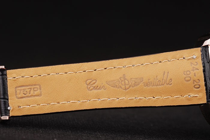 Bracelet: Calor en relieve Breitling negro correa de piel de cocodrilo con costuras de hilo blanco y un logotipo grabado Breitling plegable en oro rosa plateado clasp