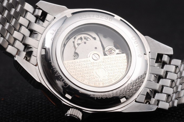 Volver: Acero inoxidable de empuje en el caso de vuelta con inscripciones Omega y transparencia en el centro revela que la mecánica within
