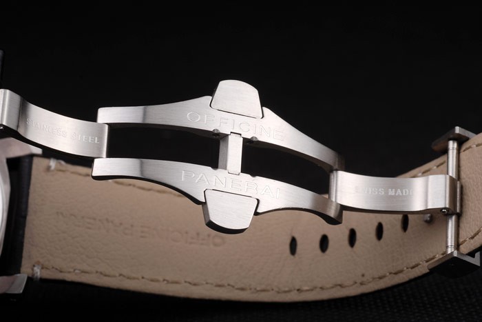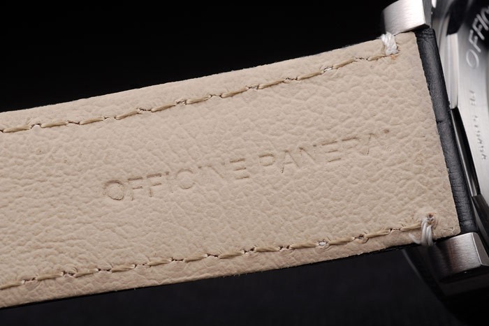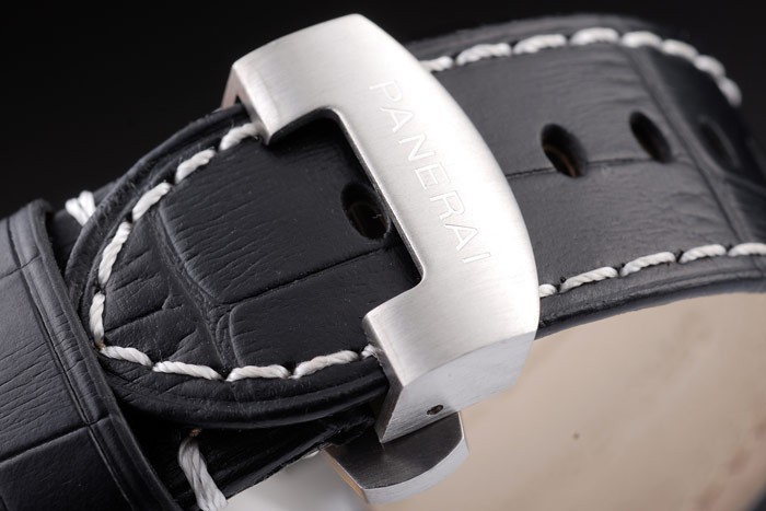 Bracelet acero inoxidable cepillado: correa de piel de cocodrilo Negro con costuras de color blanco y el calor en relieve Officine Panerai Italia sello y pulida de acero inoxidable plegado hacia dentro corchete del gancho