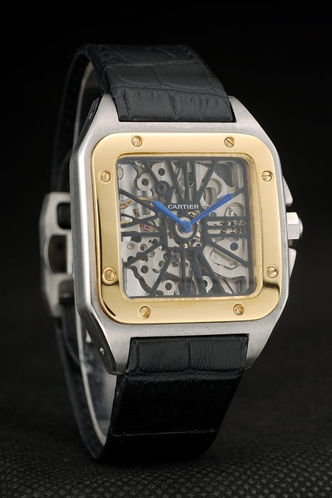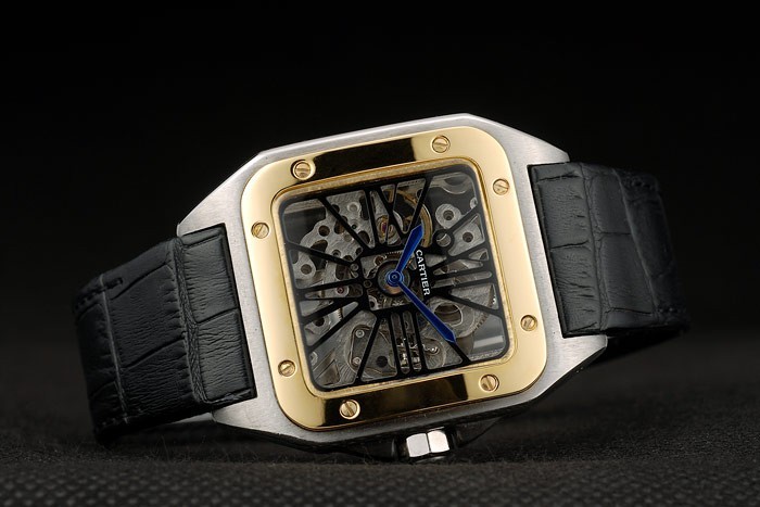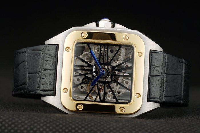 Bracelet: calor correa de piel de cocodrilo negro en relieve Cartier de acero inoxidable cepillado complemento broche mediante botón pulsador de la longitud side