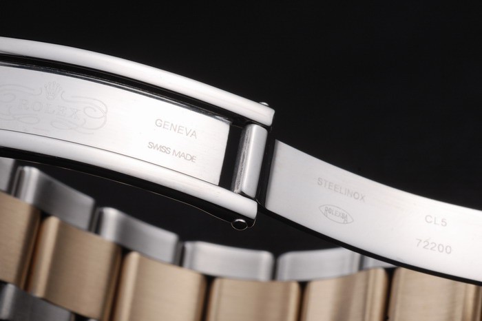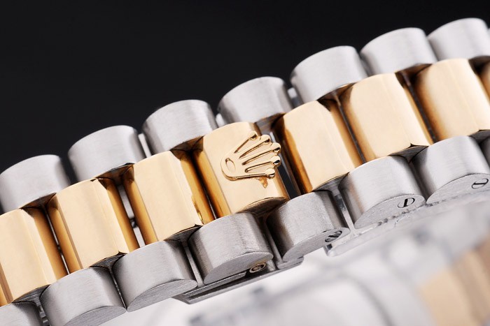 Color japonesa: acero inoxidable cepillado y amarillo cadena de eslabones de oro con el doblez sobre el corchete y Rolex corona engraving