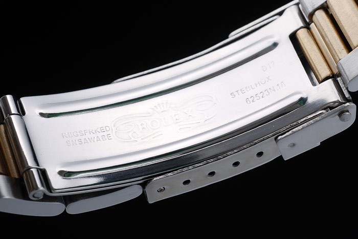 Bracelet: Dos tonos brazalete de eslabones de acero inoxidable cepillado y tono de oro con el grabado Rolex doblar por la hebilla mostrando el Rolex logo